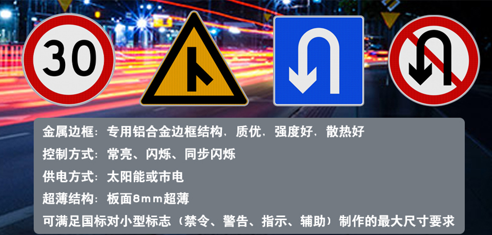 目前主要應(yīng)用在高速公路、快速道路、城市道路、農(nóng)村道路以及各類較長時(shí)間的施工圍擋區(qū)域,用于禁令、警告、指示等小型國標(biāo)標(biāo)志和彎道、分合流等事故易發(fā)多發(fā)點(diǎn)的線型誘導(dǎo)。