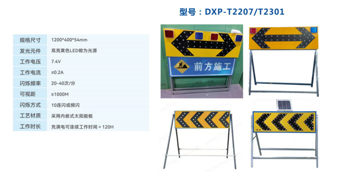 本產(chǎn)品用以通告高速公路及一般道路交通阻斷,繞行等情況。設(shè)在道路施工、養(yǎng)護路段前適當(dāng)位置??筛鶕?jù)交通情況選擇使用。本產(chǎn)品采用太陽能供電,取消了電源電纜和控制電纜,結(jié)構(gòu)緊湊可靠、安裝簡單快捷。本產(chǎn)品的發(fā)光元件采用LED聚光技術(shù),具有可視距離遠、耗能低、壽命長的特點,在同類產(chǎn)品中具有功能和價格優(yōu)勢